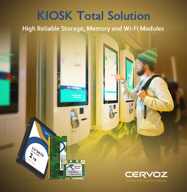 Retail service kiosk terminal application is mainly sited at indoor. It normally takes a certain period of time for user to place a single order and must be connected to the backend network to deliver various data to the background management system for analysis. Usually the capacity of storage used in the terminal machine is not too big and it takes medium level performance storage to install OS and preserve some capacity for temporary data. In this case, we recommend the client to use Cervoz 3D TLC SSD Storage, DDR4 SO-DIMM Module, and Mini PCIe Wi-Fi module to integrate their hardware products.